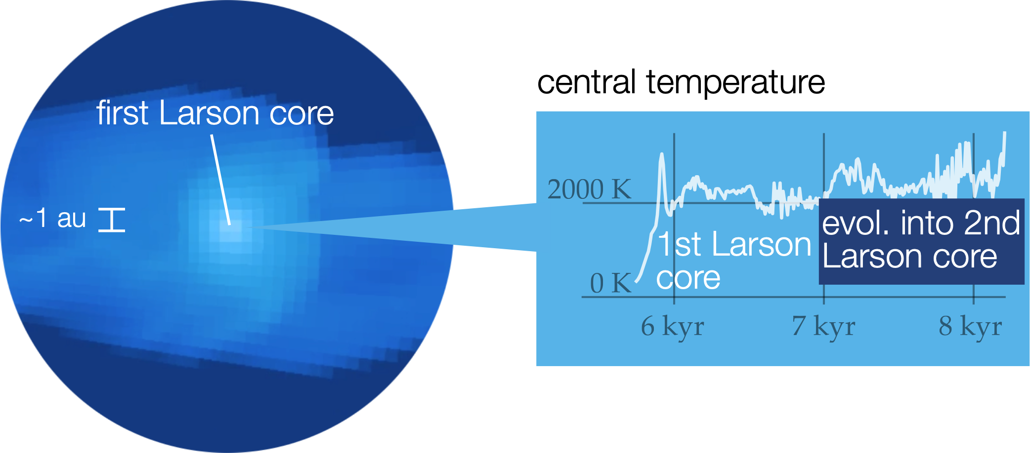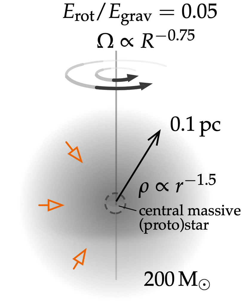 We start from the gravitational collapse of a $200\,\mathrm{M_\odot}$ cloud core with initial conditions as indicated in the figure. After 4 kyr, enough angular momentum is transferred to the center of the cloud to form an accretion disk with spiral arms; they in turn quickly start forming fragments. Fragmentation continues up to $\sim$15 kyr of evolution. We use a grid in spherical coordinates with the radial coordinate $r$ increasing logarithmically. This choice allows us to strictly conserve angular momentum around the central massive protostar and reach sub-au spatial resolutions in the midplane for $r < 100 \mathrm{\,au}$.