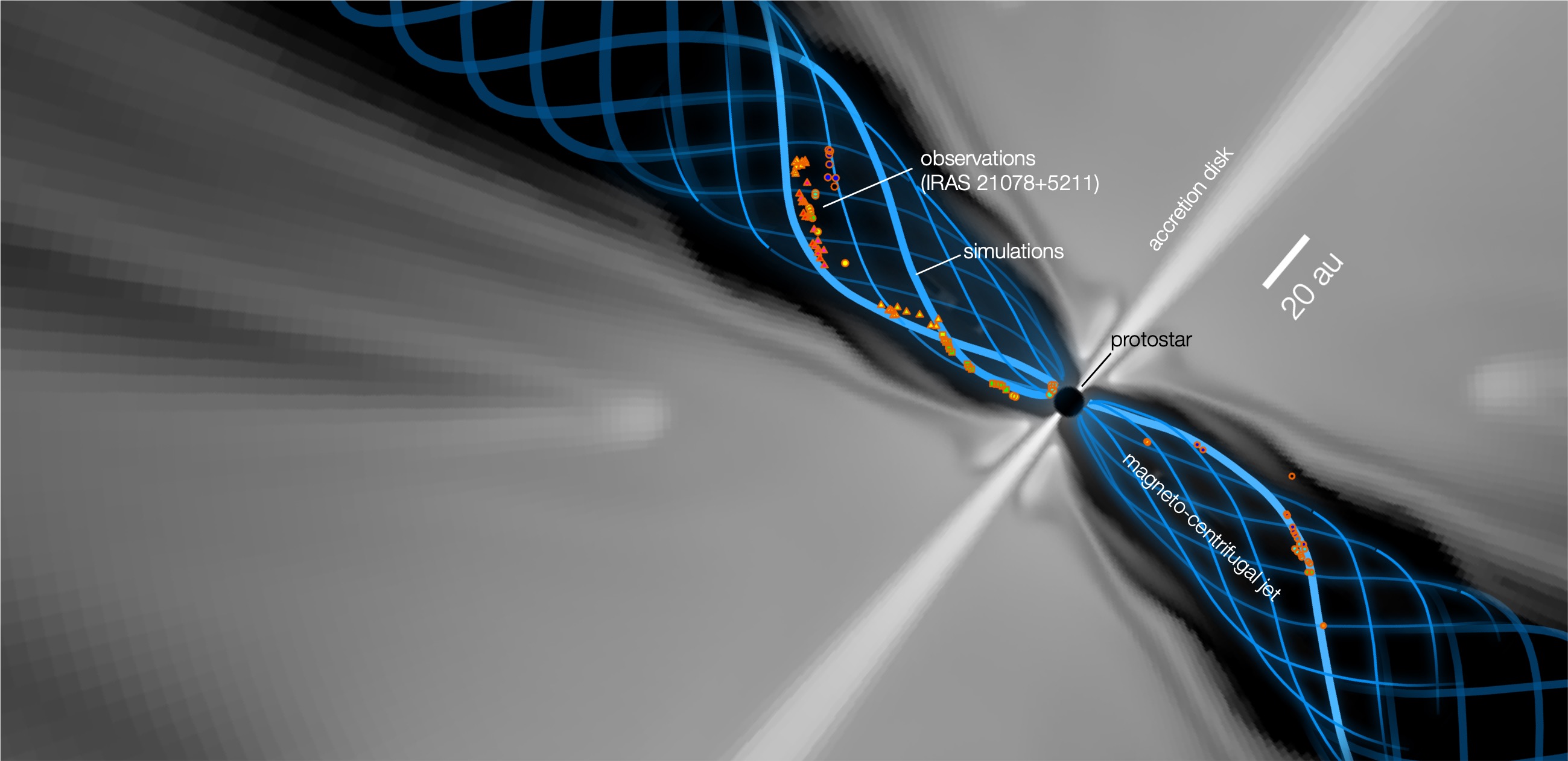 Get the papers on jetsTwo kinds of magnetic outflows are obtained: a magneto-centrifugally launched fast ($v \gtrsim 100 \mathrm{km/s}$) jet, and a magnetic-pressure-driven tower flow ($v\sim 10 \mathrm{km/s}$). A comparison of outflow streamlines from the simulation and streamlines traced by water maser observations of IRAS 21078+5211 (see figure) yielded a remarkable match, proving the magneto-centrifugal origin of early protostellar outflows.