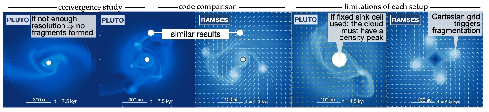 To test the robustness of our results, we performed a thorough convergence study (five different grid resolutions) using Pluto, and then we tried to replicate the results as closely as possible using the adaptive-mesh-refinement-based code Ramses. We found similar results overall, but also some differences in the early stages of the fragmentation epoch and limitations of each setup.