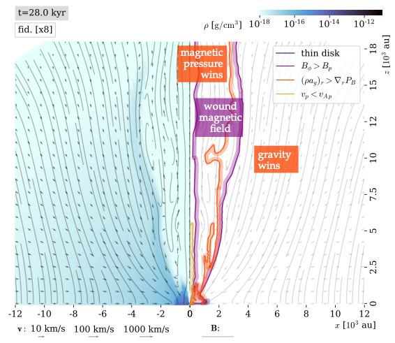 After the initial collapse, an accretion disk is formed due to angular momentum conservation. A high-speed ($\gtrsim 100 \,\mathrm{km\,s^{-1}}$) jet is launched by the magneto-centrifugal mechanism at $t\sim 5\,\mathrm{kyr}$. Incoming material from the disk reaches the jet cavity (see figure), where both the centrifugal force dominates over gravity and the flow becomes sub-Alfvénic (i.e., it is forced outwards following the mostly poloidal magnetic field lines). At distances of $\sim 1000\,\mathrm{au}$ away from the protostar, magnetic hoop stress re-collimates the fast outflow.